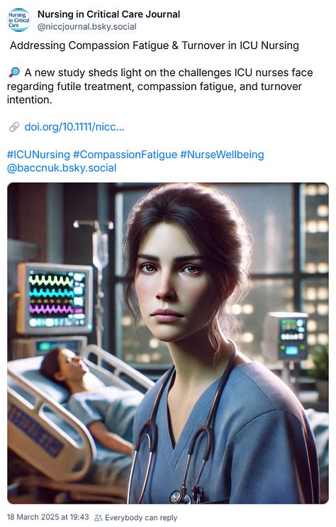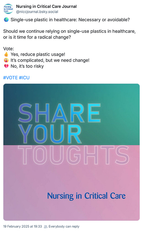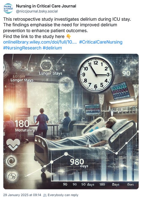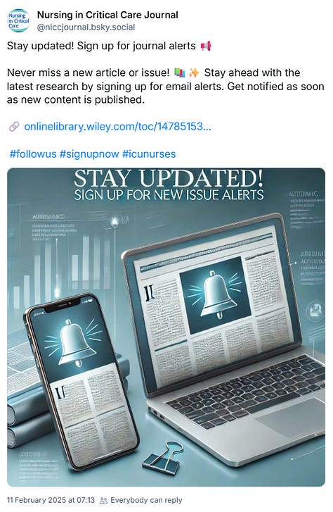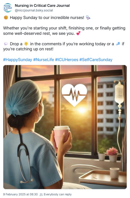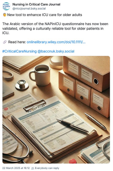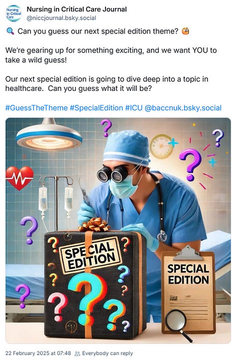 We use our Bluesky largely to repost recent studies and articles related to paediatrics; because of this, we follow a large array of journal accounts. One such account is Nursing in Critical Care, a journal published by Wiley and indexed on PubMed - in short, a reputable journal.