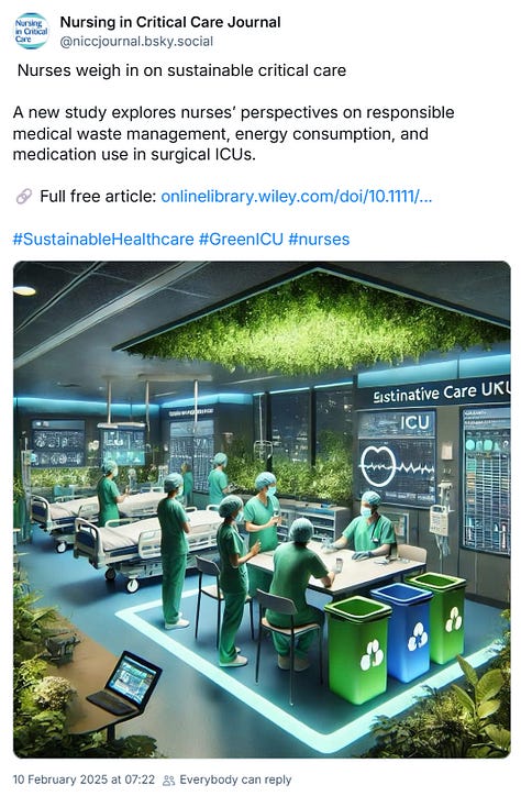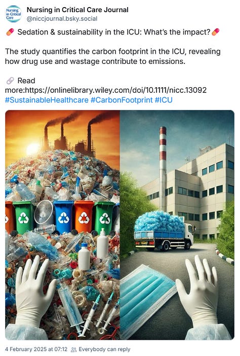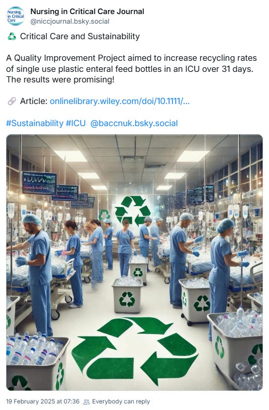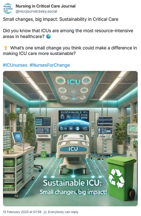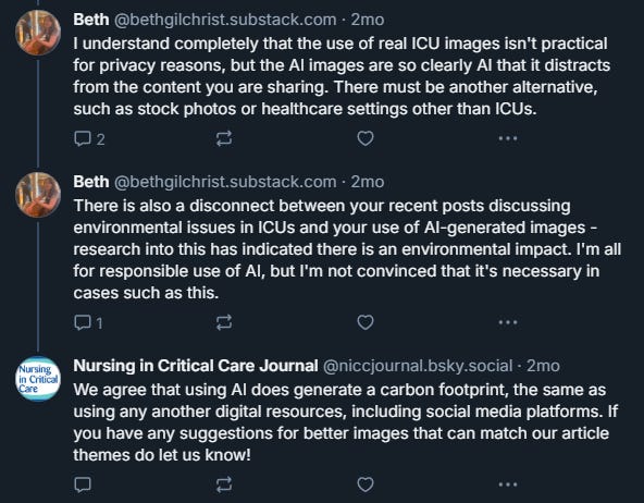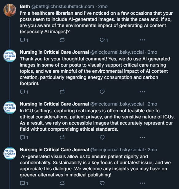 Through my own Bluesky account, I politely challenged one such example on the basis of its poor quality and the message of the post, which was about sustainability and environmental concerns in the ICU. One issue I raised was the environmental impact of generative AI, particularly AI-generated images; there has been considerable research into the environmental impacts of this. When the end result is as poor as the examples on your journal's Bluesky feed, it does not seem worth the energy expended, and it somewhat damages the reputability of your journal. The response I got was evasive; this can be seen here, in the feed below the original post.