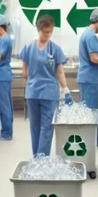 Where to start with this absolute mess? Why are there so many recycling bins overflowing with plastic bottles? Why are the arrows on said bins so warped? And how is this medical professional seemingly able to rotate her head and torso 180 degrees?